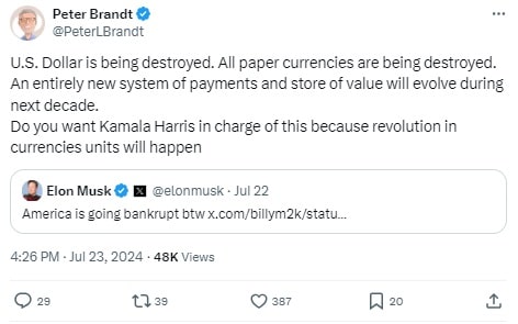 Jednocześnie Brandt wyraził obawy, czy aby na pewno Kamala Harris jest odpowiednią osobą, która zajmie się tworzeniem tego nowego systemu. Jak napisał Brandt: Całkowicie nowy system płatności i przechowywania wartości będzie ewoluował w ciągu następnej dekady. Czy chcesz, żeby zajęła się tym Kamala Harris, bo nadejdzie rewolucja w jednostkach walutowych?