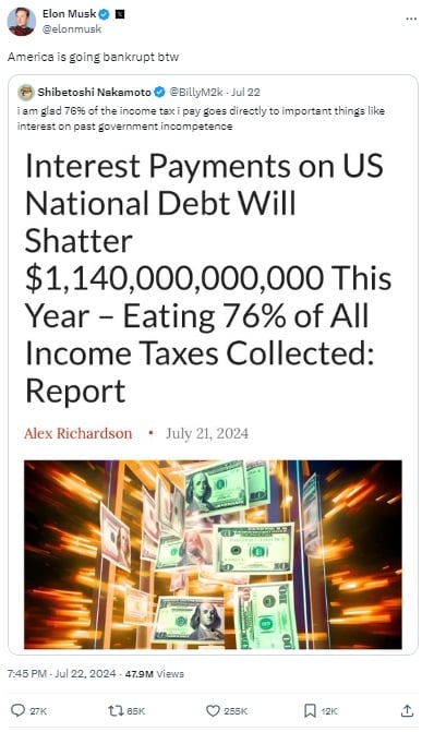 Narracja o możliwej zapaści gospodarki i głównych walut fiducjarnych pojawia się ostatnio często we wpisach i wypowiedziach znanych analityków i inwestorów. Jednym z nich jest Elon Musk, który kilka dni temu narobił sporo zamieszania jednym krótkim wpisem na X o treści: „Tak w ogóle, to Ameryka zbankrutuje”. Tym samym poparł spostrzeżenia Billego Markusa, założyciela Dogecoina, który ocenił, iż Stany Zjednoczone są na drodze do bankructwa z powodu złego zarządzania funduszami. Chociaż Musk nigdy nie stwierdził, iż miejsce dolara zajmie Bitcoin, to znany jest ze swej sympatii do Dogecoina. Niedawno zapowiedział nawet, iż w przyszłości umożliwi dokonywanie płatności w Dogecoinach w salonach Tesli.