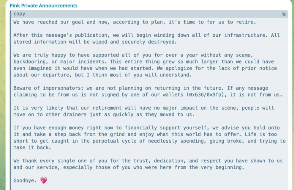 Zaawansowana „usługa” służąca do drenowania portfeli kryptowalutowych o nazwie Pink Drainer ogłosiła … przejście na emeryturę. Przyjemną jesień życia ma cyberprzestępcom umożliwić zgromadzone 75 milionów (!) dolarów pochodzące od prawie 20 000 ofiar. Na kuriozalne oświadczenie hakerów trafiliśmy na kanale Telegram należącym do znanego i lubianego „detektywa on-chain„, ZachaXBT.