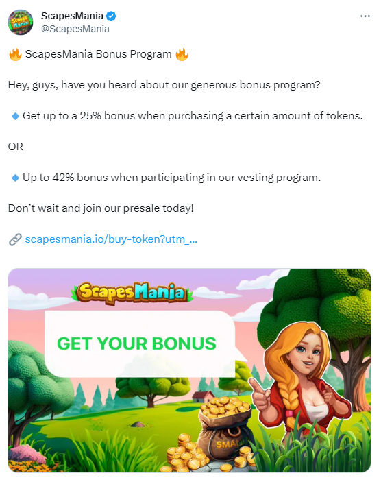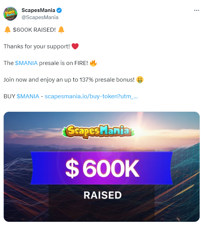 Brzmi intrygująco? Sprawdź jeden z takich obiecujących projektów — ScapesMania. Ten nowy gracz zebrał już 970 000 dolarów w samej przedsprzedaży, a 15 000–50 000 dolarów zbieranych jest codziennie. Gdy ScapesMania zbliża się do kamienia milowego w zakresie zbiórki funduszy o wartości 1 miliona dolarów, wydaje się, iż może go przewyższyć!