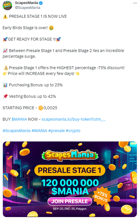 Jak wspomniano powyżej, tokeny ScapesMania są teraz bardzo tanie po zaledwie 0,003362 USD za monetę podczas przedsprzedaży. Po debiucie cena osiągnie 0,01 USD, co zapewni znaczny zwrot w wysokości 400%. Z perspektywy czasu tylko nielicznym projektom w przeszłości udało się zyskać tak wysoką wartość po listingu, co po raz kolejny pokazuje, iż zespół dobrze wykorzystał dotychczasową przedsprzedaż.