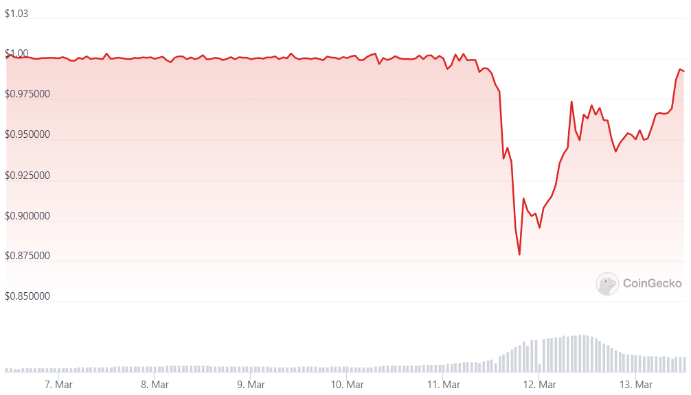 Cena spadła do zaledwie 0,87 USD w weekend w związku z obawami o rezerwy USDC o wartości około 3,3 miliarda USD przechowywane w Silicon Valley Bank, który został zamknięty przez Kalifornijski Departament Ochrony Finansowej i Innowacji 10 marca.