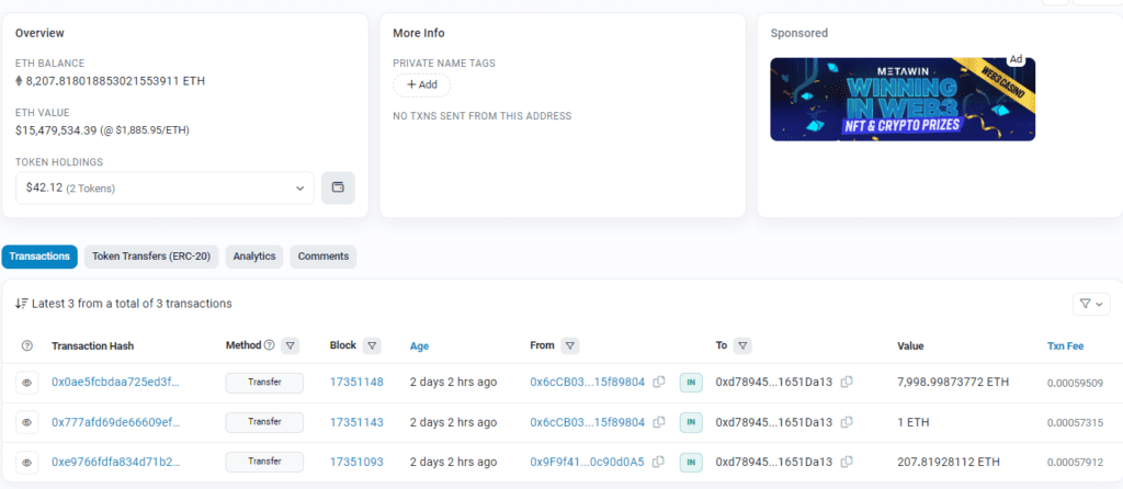 W zaskakującym zwrocie akcji który nie zdarza się zbyt często, uśpiony portfel który nabył aż 8000 sztuk Ethereum w czasie oferty publicznej (ang. ICO – Initial Coin Offering – przyp. red.) nagle ożył. W tej chwili przenosi on swoje środki na inne adresy w bliżej nieokreślonym celu. Najpierw wysłano 1 ETH w formie „testu”, a w kolejnej transzy poszło aż 7999 eterów. Transakcja przyciągnęła uwagę analityków on-chain z firmy Lookonchain, którzy natychmiast poinformowali o tym wydarzeniu na Twitterze.
