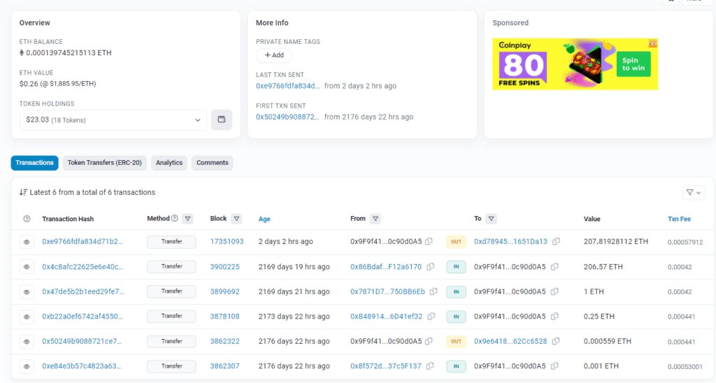 W zasadzie jedynym innym znakiem życia na tym konkretnym portfelu była transakcja przychodząca w wysokości 207 eterów (ok. 380 000 USD), pochodząca z jeszcze innego portfela, który pozostawał nieaktywny od 2017 roku.