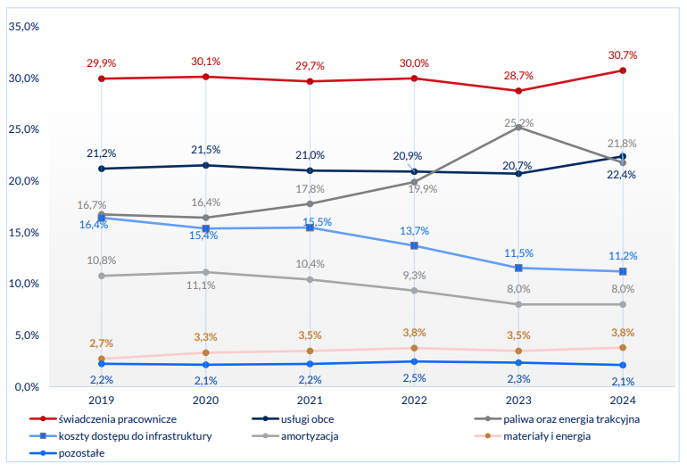 W 2024 r. największą pozycję w strukturze kosztów zarządców infrastruktury i przewoźników pasażerskich stanowiły świadczenia pracownicze, których udział wyniósł odpowiednio 39,9% i 30,7%. Z kolei w sektorze towarowym najwyższy udział w kosztach przypadał na amortyzację – w 2024 r. udział tej pozycji wzrósł do 29,6% wobec 11,2% w 2023 r. (głównie z powodu odpisów amortyzacyjnych w spółce PKP Cargo w trakcie restrukturyzacji). Spadek zatrudnienia w przewozach towarowych przełożył się także na niższe wydatki na świadczenia pracownicze – udział tej pozycji uległ zmniejszeniu do 20,3% w 2024 r. wobec 25,2% w 2023 r. (30,3% w 2019 r.). Trzecią pod względem obciążenia pozycję kosztową (18,5%) w tym segmencie stanowiły usługi obce – m.in. naprawy, modernizacje i usługi utrzymaniowe. U zarządców infrastruktury i przewoźników pasażerskich były to koszty drugiej co do wielkości kategorii (odpowiednio 26,8% i 22,4%).