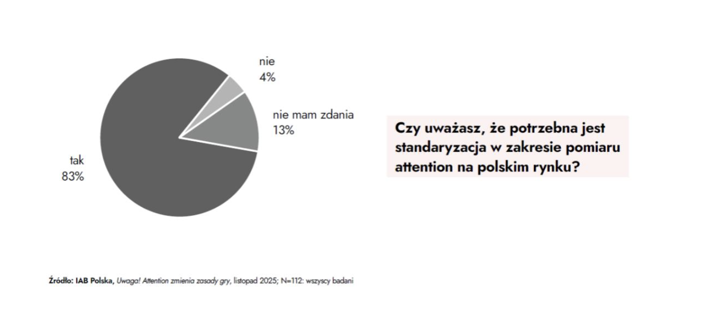 Zrozumiałe jest więc, iż zdecydowana większość respondentów (82,9%) wskazuje również na pilną potrzebę standaryzacji pomiaru uwagi. To jedne z najbardziej jednoznacznych wyników całego badania – jasny sygnał, iż rynek oczekuje wspólnych definicji, metod i zasad, które pozwolą porównywać wyniki między kampaniami, kanałami i dostawcami.