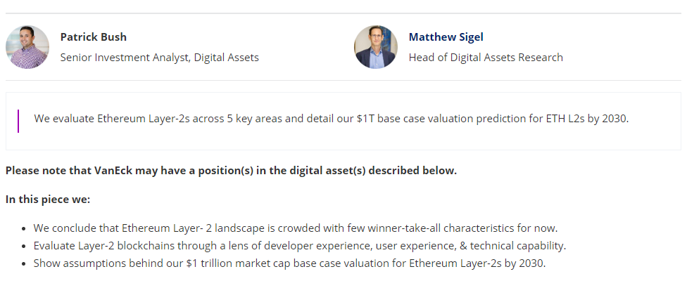 Prognozy nt. wyceny firmy VanEck opierają się na dokładnej ocenie kilku kluczowych czynników, w tym cen transakcji, doświadczenia deweloperów i użytkowników, założeń dotyczących zaufania oraz ogólnego rozmiaru ekosystemu L2. Raport podkreśla znaczenie sieci w ułatwianiu rozwoju ekosystemu Ethereum, prognozując ekspansywną przyszłość, w której rozwiązania L2 nie tylko zwiększają skalowalność Ethereum, ale także przyciągają znaczną wartość ekonomiczną.