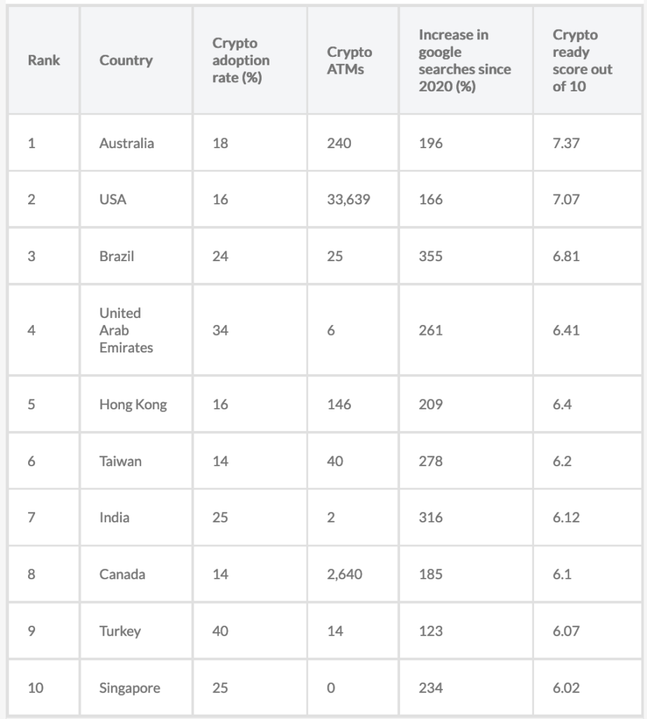 Według raportu HedgewithCrypto, największą gotowością do zwiększania adopcji mogą pochwalić się Australia, USA, Brazylia, Zjednoczone Emiraty Arabskie oraz Hong Kong. Zaraz za nimi plasują się Tajwan, Indie, Kanada, Turcja oraz Singapur. Mówimy tu o „gotowści na krypto”, a ranking uwzględnia także stopień obecnej już adopcji, ilość kryptowalutowych bankomatów oraz zwiększenie ilości zapytań Google na temat kryptowalut w ostatnich latach. Zestawienie poniżej.