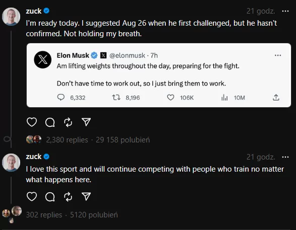 Jak informowaliśmy wczoraj, na X (dawniej Twitter) jak grom z jasnego nieba wpadła infomacja, iż technologiczny wizjoner i właściciel firm X, Tesla i SpaceX, Elon Musk, zmierzy się w pojedynku MMA z właścicielem firmy Meta (dawniej Facebook), którym jest Mark Zuckerberg. Wiadomość pojawiła się po długiej przerwie, co poskutkowało tym, iż wiele osób zaczeło wątpić iż w ogóle do niej dojdzie. Wydarzenie będzie miało miejsce prawdopodobnie na oktagonie w Las Vegas, a zebrany dochód zostanie przekazany na cele charytatywne.