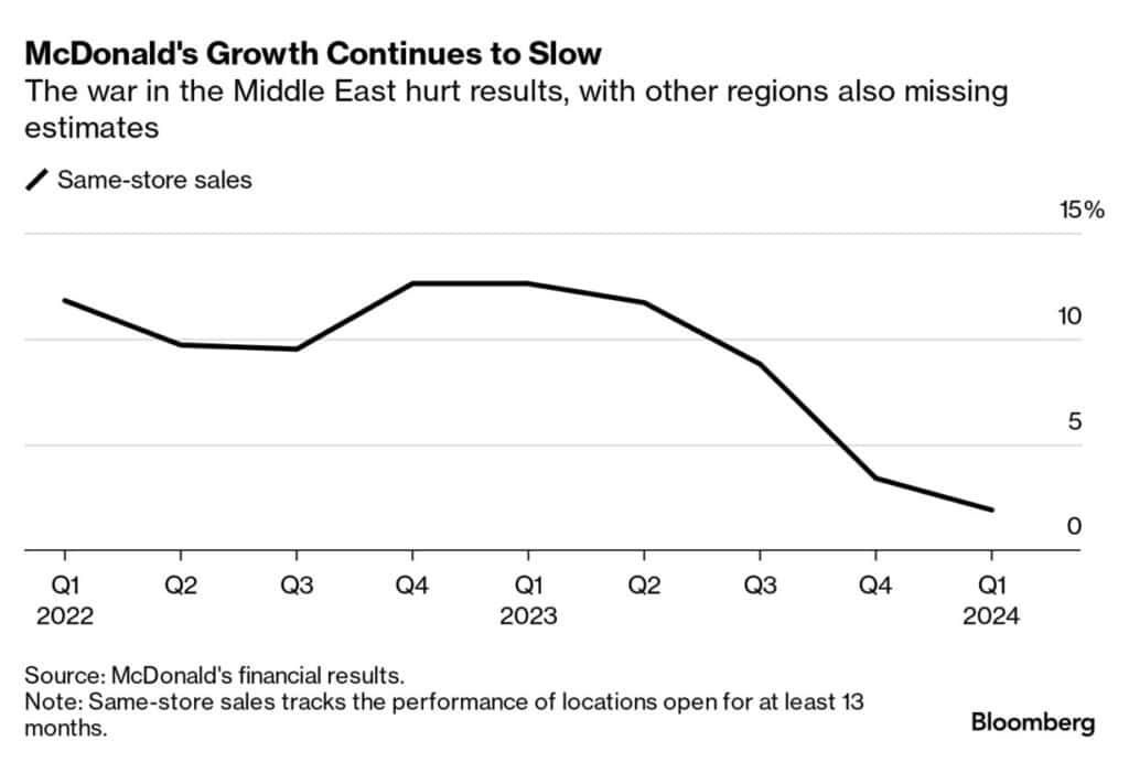 Akcje MdDonald’s radzą sobie coraz słabiej na amerykańskim rynku akcji. Nie tylko ostatni, nieco rozczarowujący raport miał na to wpływ. Dane gospodarcze z całego świata sugerują, iż konsumenci choć wciąż wydają sporo, powoli słabną lub ograniczają wydatki. Zupełnie tak samo jest w Stanach Zjednoczonych, największym rynku dla McDonald’s. Akcje spółki mają za sobą największy spadek od 2020 roku, gdy globalny biznes stanął w obliczu pandemii koronawirusa. Od 1 stycznia spadły o ok. 15%, co dla relatywnie mało zmiennego waloru, jakim dotychczas były stanowi statystycznie istotne odchylenie. Niektórzy twierdzą, iż spadek cen akcji lidera sprzedaży stanowi ostrzegawczy sygnał. Jak widzimy na obu grafikach poniżej, sprzedaż porównywalna istotnie spadała w całym 2023 roku i w I kwartale 2024 roku ponownie rozczarowała.