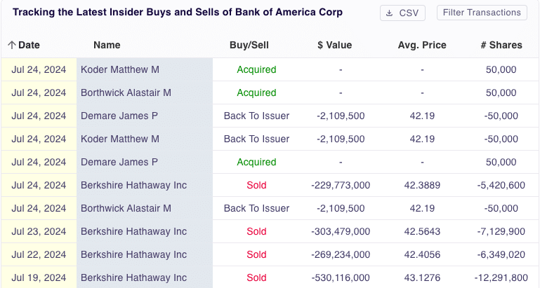Firma Berkshire Hathaway, którą zarządza znany inwestor Warren Buffett, kontynuuje wyprzedaż swoich udziałów w Bank of America (BofA). Przez ostatnie dziewięć dni handlowych, Berkshire sprzedało łącznie 71,2 miliona akcji, co przyniosło mu około 3 miliardy dolarów zysku. Ostatnia sprzedaż, obejmująca 18,4 miliona akcji, miała miejsce od czwartku do poniedziałku, przy średniej cenie 41,65 dolara za akcję. Łącznie przyniosło to 767 milionów dolarów.