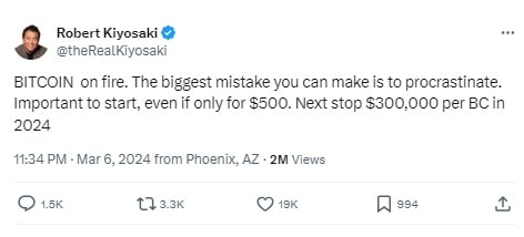 Źródło: https://x.com/theRealKiyosaki/status/1765506264077906271Jeśli pierwsza prognoza się sprawdzi, inwestycja w BTC w 2014 r. wzrośnie do 500 000 dolarów pod koniec grudnia. Z kolei „skromniejszy” wariant mógłby przynieść zyski w wysokości 249 000 dolarów.