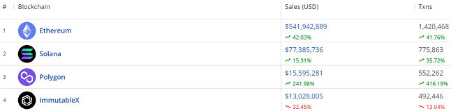 W ciągu ostatnich 30 dni dane z CryptoSlam pokazują, iż Solana odnotowała ponad 77 milionów dolarów sprzedaży NFT, podczas gdy protokół przetwarzał ponad 775 000 transakcji, pokonując inne popularne protokoły, takie jak Polygon i ImmutableX. Tylko Ethereum (ETH) odnotowało więcej przetworzonych sprzedaży i transakcji NFT, co pokazuje, iż Solana pozostaje silnym jego rywalem.