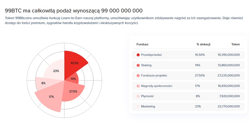 Sama marka 99Bitcoins jest znana w branży. Otóż już w 2014 roku 99Bitcoins wprowadziło poradniki na temat kryptowalut. Teraz czas na kolejny krok w rozwoju, czego efektem jest token $99BTC. Moneta powstała przy zastosowaniu standardu ERC-20 na blockchainie Ethereum, natomiast twórcy przygotowują się do przejścia na standard BRC-20, chcąc wykorzystać siłę i popularność sieci Bitcoin. Pozwoli to programistom tworzyć zdecentralizowane aplikacje, NFT i inne rozwiązania oparte na blockchainie Bitcoin.