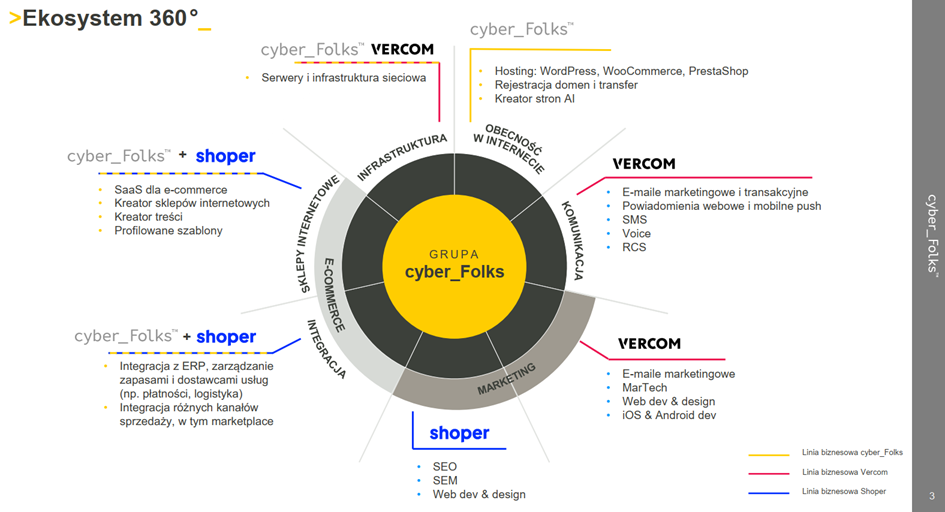 Tutaj dobrym przykładem z naszego podwórka jest CyberFolks i przejęcie spółki Shoper. CyberFolks to firma, która zajmuje się hostingiem stron internetowych. Z kolei Shoper oferuje narzędzia do tworzenia sklepów e-commerce.