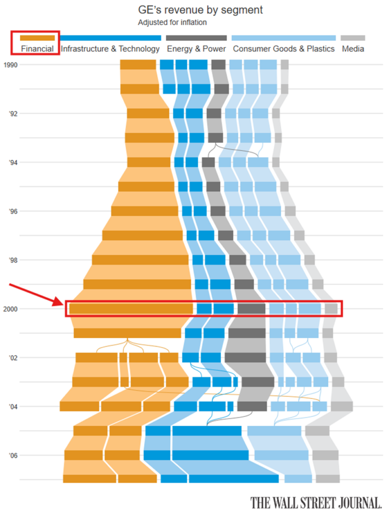 Jack Welch wierzył, iż zarządzanie to powtarzalna kompetencja. Rzekomo wystarczy odpowiedni system KPI, ranking menedżerów i dyscyplina kapitału, by każda jednostka działała efektywnie. GE kupowało więc firmy w niemal każdej branży: od telewizji (NBC), przez produkcję silników lotniczych, po sprzęt AGD, diagnostykę medyczną, a nawet… kredyty hipoteczne i leasing samochodowy. Na przełomie wieku – w roku 2000, GE Capital odpowiadało już za ponad połowę przychodów całej grupy, i za około 60% zysków, a z przemysłowego producenta GE przeobraziło się w quasi-bank z bilansem większym niż większość ówczesnych instytucji finansowych.