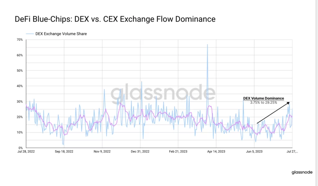 Glassnode analizował przepływy giełdowe zdecentralizowanych vs. scentralizowanych giełd dla ośmiu topowych projektów DeFi. Widać ewidentnte, ponowne zainteresowanie DEX-ów. Udział wolumenu w obrocie na DEX wzrósł z 3,75% na początku czerwca do 29,2% obecnie. Nagle ponownie znajduje się w okolicach szczytów z drugiej połowy 2022 roku.