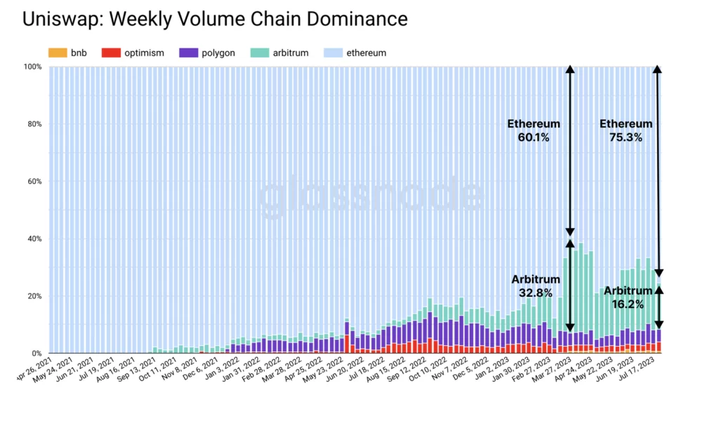 Badając rozkład wolumenu transakcji na Uniswapie w różnych protokołach warstwy 2, Glassnode wskazuje na nieco więcej konstruktywnych dla De-Fi wniosków. Znaczna część handlu przeniosła się z głównej sieci Ethereum do Arbitrum (32% wolumenu w marcu).Trend utrzymywał się na wysokim poziomie w czerwcu i lipcu. To stanowi pewne uzasadnienie dla niższego wolumenu na Ethereum-Uniswap, który widzimy wyżej.