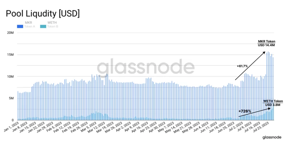 Źródło: GlassnodeOd czasu ogłoszenia odkupu Maker, największą pulą płynności dla Makera na Uniswap (V3) była pula MKR/WETH. Doświadczyła skokowego wzrostu płynności. Dla puli, która zawierała fundusze MKR, głębokość WETH wzrosła o ponad 700%. Dostawcy płynności sygnalizują oczekiwanie wyższych wolumenów handlowych dla pary MKR-WETH. Czy można jej oczekiwać bez wyższej aktywności De-Fi?