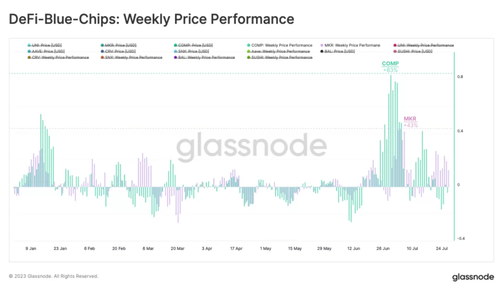 - Planowane Bitcoinowe ETF-y przez instytucje jak Fidelity czy BlackRock spowodowały szerszą, pozytywną reakcję sektora de-fi;