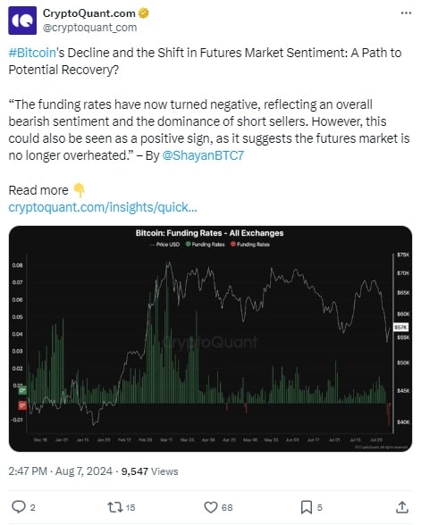 Źródło: https://x.com/cryptoquant_com/status/1821166281493508207Według aktualnych obliczeń CryptoQuant Bitcoin znajduje się w tej chwili w fazie początkowej rynku niedźwiedzia. Wskazuje na to opisany powyżej indeks zysków i strat, który spadł poniżej swojej 365-dniowej średniej kroczącej (MA). Ostatni taki sygnał wskaźnik sugerował w styczniu 2023 r.