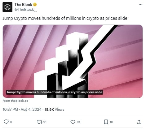 Pierwszym sygnałem, który zaczął budzić obawy społeczności były działania Jump Crypto. Firma odblokowała według różnych szacunków od 11 do 19 tys. tokenów ETH. Ostatnią sprzedaż ze strony Jump Crypto odnotowano 7 sierpnia. W ostatnich dniach Jump Crypto średnio co godzinę likwidowało około 2 miliony dolarów w ETH. Analitycy szczególnie uważnie przyglądają się również firmie Grayscale. Jej portfel zawiera 2,33 mln ETH. Śledzone są również pozostałe tokeny z portfeli Jump Crypto, ICO i innych wielorybów.