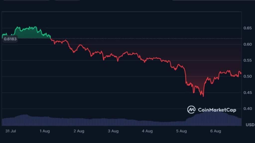 Fot. materiały partneraPomimo widocznego zainteresowania ze strony wielorybów XRP nie był odporny na ogólnorynkową wyprzedaż. Cena tokena spadła w poniedziałek o 15% w ciągu godzin do poziomu 0,44 USD. Jeszcze tego samego dnia kryptowaluta odrobiła większość strat i ponownie przekroczyła poziom 0,50 USD. Spadek ten został przypisany różnym czynnikom, takim jak: