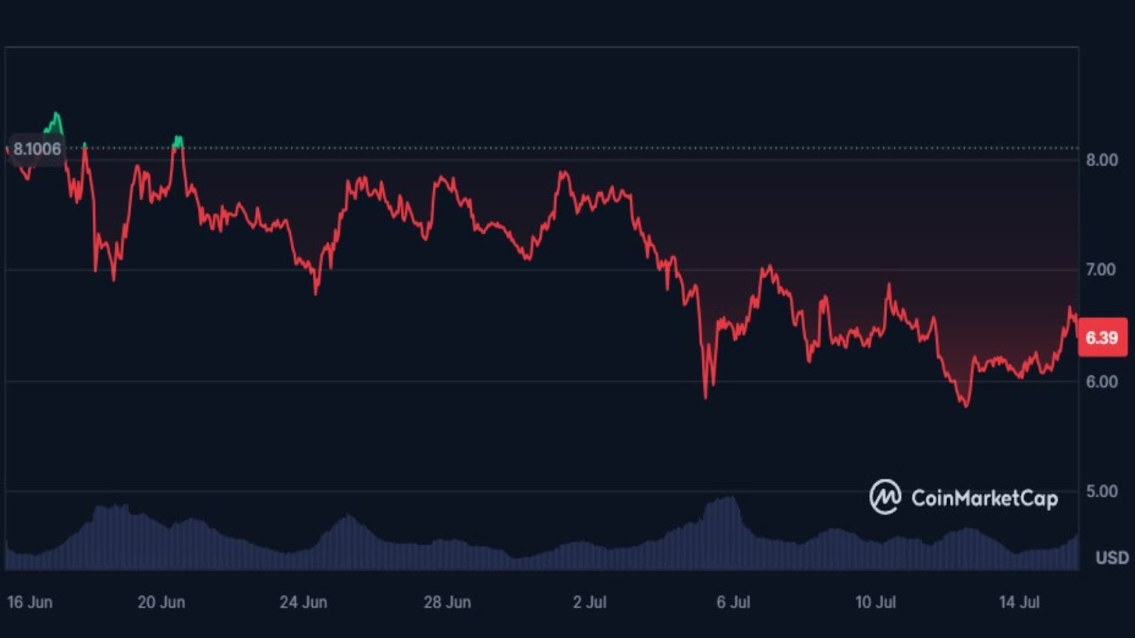 Trend spadkowy zdaje się jednak dobiegać końca. Kurs RNDR w zeszłym tygodniu zaczął się konsolidować w okolicach 6 USD. Choć w lipcu znajdował się choćby poniżej tej granicy, zdołał odrobić część strat.