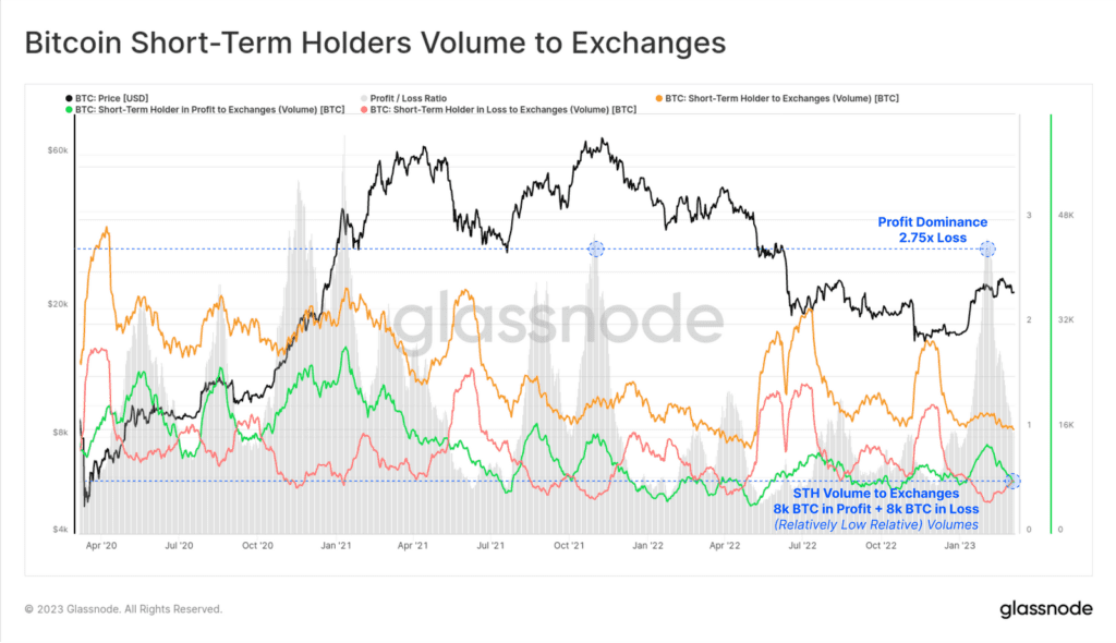 Źródło: GlassnodeWpływ nowych inwestorów Glassnode mierzy obserwując wolumeny BTC wysyłane na giełdy, które były albo w zysku albo w stracie. Stosunek wolumenu BTC wysyłanych na giełdy przez krótkoterminowych inwestorów w zysku wobec wolumenu wysyłanego w stracie osiągnął szczyt na poziomie wielokrotności 2,75 na początku lutego. Całkowity wolumen BTC posiadanych przez adresy STH wysyłanych na giełdy wynosi dziś około 16 tys. BTC dziennie i dzieli się w przybliżeniu pół na pół zysk vs strata (równowaga). Relatywnie jest to wciąż stosunkowo niski wolumen wysyłanych BTC na giełdy w porównaniu do całego cyklu 2020-23.