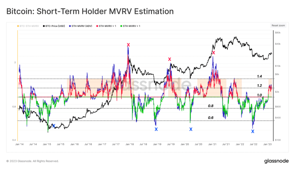 Źródło: GlassnodeDane on-chain pozwalają ocenić wskaźnik MVRV dla krótkoterminowego inwestora w BTC, aby oszacować względny niezrealizowany zysk inwestorów krótkoterminowych (STH). Analizując poprzednie cykle, możliwość realizacji zysków przez STH rośnie w okresach, w których średnia ich zysków wynosi ponad 20%. Ostatnie spadki z poziomu 23 800 USD wyraźnie pokrywają się z taką strukturą, ponieważ STH-MVRV osiągnął właśnie wartość 1.2 nim zaczął spadać. jeżeli rynek spadnie z powrotem do poziomu 19 300 USD przywróci STH MVRV do wartości 1,0 i pokaże, czy ceny spot wróciły podstawy kosztów tej grupy nowych nabywców.