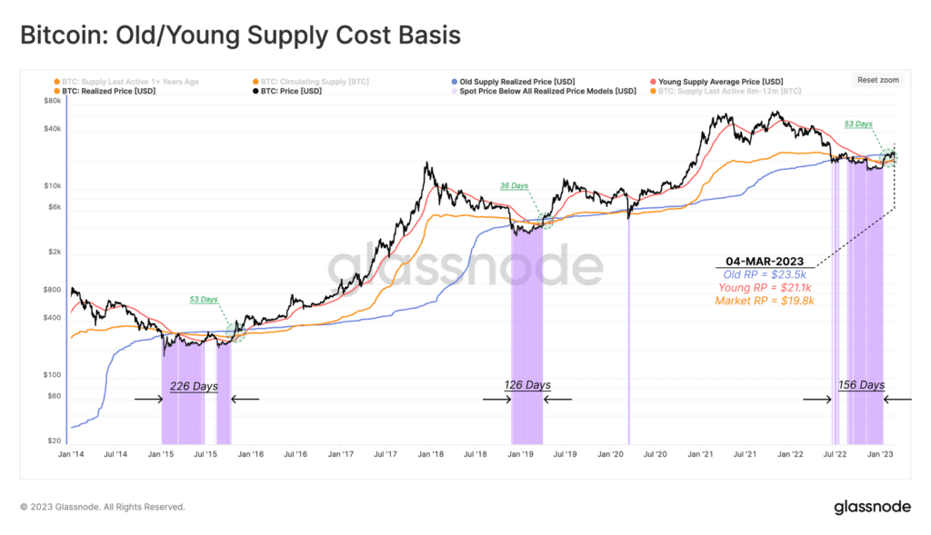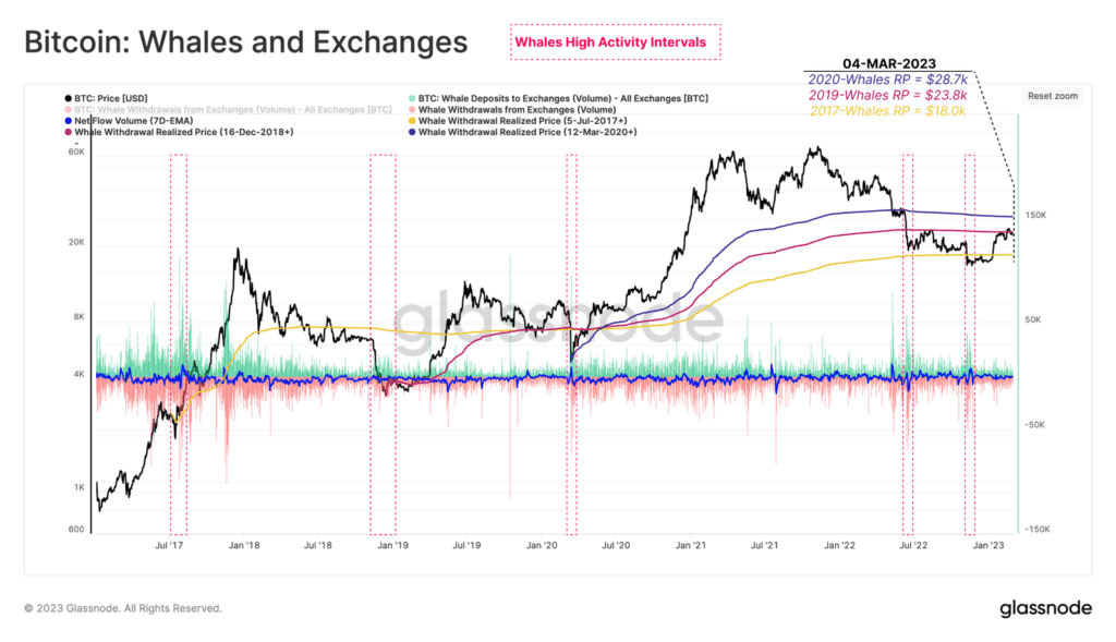 Wszystkie te trzy grupy wielorybów doświadczyły średnio niezrealizowanej straty gdy Bitcoin spadł poniżej 18 000 USD po implizji FTX w listopadzie 2022. Ciekawym jednak jest, iż ostatnie spadki przyspieszyły wobec słabnącego popytu na poziomie przybliożnej podstawie kosztowej wielorybów akumulujących BTC z okresu grudnia 2019 tj. 23 800 USD, a dodatkowo poziom ten zbiegł się ze średnią ceną nabycia BTC przez starszą niż 6 miesięcy podaż co potencjalnie sugeruje a) trwalsze osłabienie sentymentu b) aktywniejszą podaż długoterminowych oraz również majętnych inwestorów.