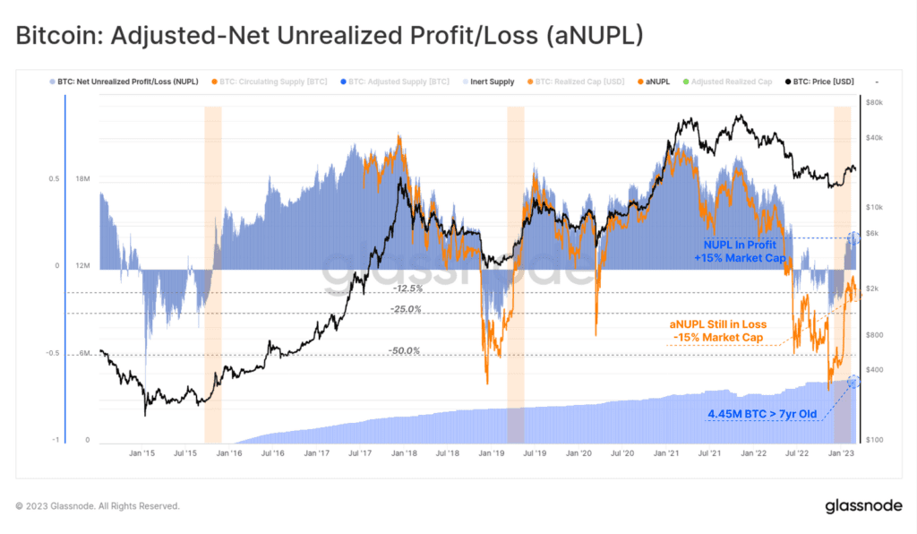 Źródło: GlassnodeObecny stan rynku Glassnode opisuje jako fazę przejściową, która zwykle występuje w późniejszych fazach bessy. Twierdzenie to można zaobserwować w metryce niezrealizowanego zysku/straty netto (NUPL). Od połowy stycznia, średnia tygodniowa NUPL wzrosła ze stanu niezrealizowanej straty netto do stanu pozytywnego. Co to nam mówi? Że przeciętny właściciel Bitcoina ma w tej chwili niezrealizowany zysk netto o wielkości około 15% kapitalizacji rynkowej. Ten wzór przypomina strukturę rynku odpowiadającą fazom przejściowym na poprzednich rynkach niedźwiedzia. Glassnode może również stworzyć wskaźnik odejmując niezrealizowany zysk zablokowany w części podaży liczącej więcej niż 7 lat (bardziej 'uaktualnić metrykę’) patrząc na skorygowany aNUPL. Według tej miary, rynek jest dziś ledwo poniżej progu rentowności, i można argumentować, iż przez cały czas utrzymuje się w rynku niedźwiedzia.