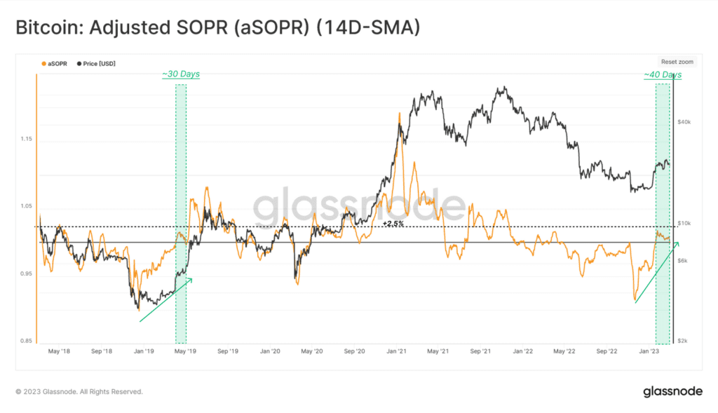 Źródło: GlassnodeGdy więcej Bitcoinów zaczyna poruszać się w sieci, Glassnode sprawdza metrykę aSOPR, aby ocenić średni zysk (lub stratę) zrealizowane przez dokonujących transakcje. Średnia dwutygodniowa aSOPR jest dziś notowana powyżej wartości 1 nieprzerwanie od 40 dni. Wzorzec ten podkreśla pierwszy trwały zryw w realizacji zysków od marca 2022 roku i odzwierciedla powrót napływającego kapitału wystarczający do zaabsorbowania podaży (nowy popyt). Powrót aSOPR powyżej 1,0 w dość trwały sposób jest typową cechą w miarę jak rynek odradzał się po okresie głębokich i przedłużonych strat (w maju 2019 30 dni, na początku 2023 – 40 dni).