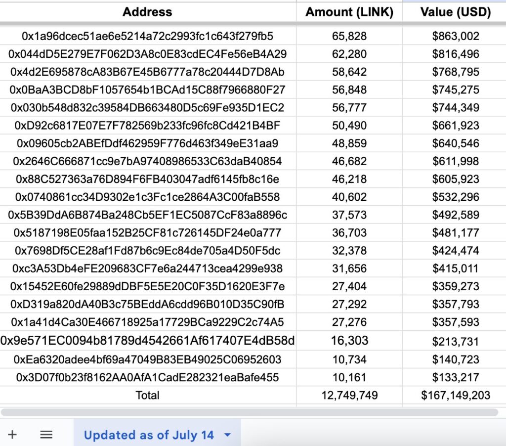 Dane z łańcucha bloków, opublikowane i przeanalizownae przez firmę specjalizującą się w ekspertyzach on-chain: Lookonchain, pokazują, iż tajemniczy wieloryb zgromadził bardzo dużą ilość tokenów Chainlink (LINK). Zdaniem analityków aż 93 powiązanych ze sobą portfeli zgromadziło łącznie 12,75 milionów sztuk kryptowaluty LINK, o wartości po aktualnym kursie ok. 160-170 milionów dolarów amerykańskich. Proces ten trwał już od 24 czerwca, pokazuje więc poważne zaangażowanie i pewność siebie ze strony „grubego portfela”. Chainlink to zdecentralizowana sieć wyroczni (Oracles) na blockchainie, która umożliwia projektom Web 3.0 na pozyskiwanie na bieżąco wiarygodnych danych ze świata rzeczywistego.