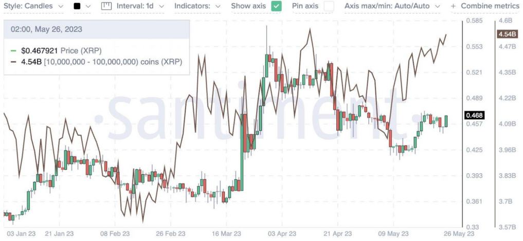 — Ali (@ali_charts) May 26, 2023Trend akumulacyjny zaobserwować można w szczególności u adresów krypto posiadających od 10 do 100 milionów tokenów XRP. Okres intensywnego gromadzenia kryptowaluty rozpoczął się 7 maja, niecały miesiąc po zauważalnej presji sprzedażowej, która miała miejsce 12 kwietnia.