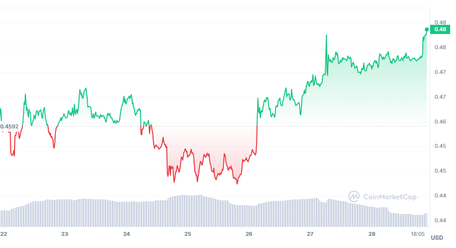 Wykres XRP sugeruje zbliżający się ruch na północ. Aprecjacja tokenu Ripple trwa od 26 maja, a na moment powstawania tego tekstu jego cena wynosi blisko 0,48 dolara za sztukę, tuż po zauważalnym wzroście w przeciągu ostatnich dwóch godzin.