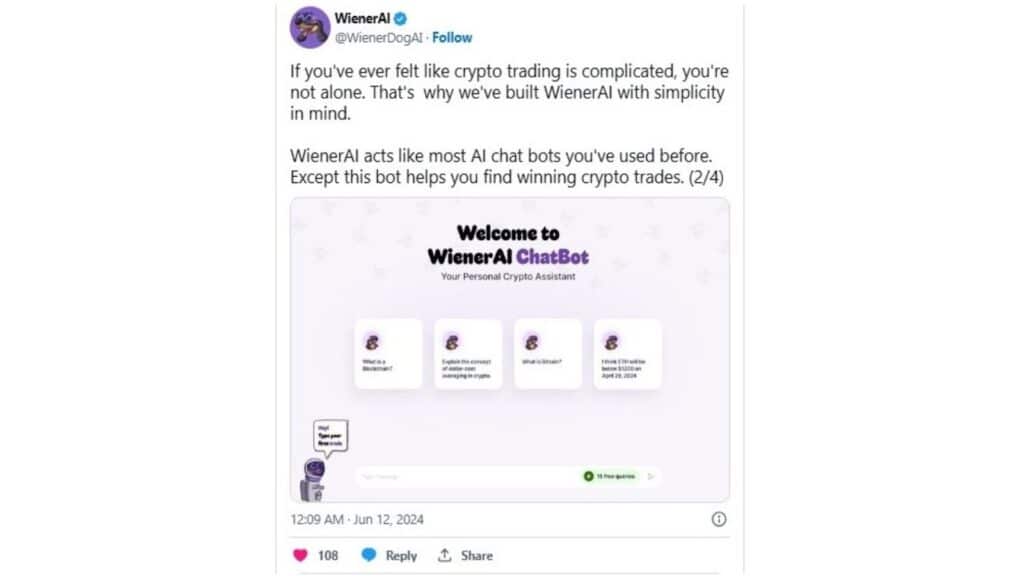 Ten memecoin AI, przez wielu określany jako „ChatGPT kryptowalut”, opiera się na uroczej postaci – zabawnej hybrydzie psa, kiełbaski i robota, a dodatkowo działa jako łatwy w obsłudze bot handlowy. Jego celem jest ułatwienie zarówno początkującym, jak i doświadczonym traderom inwestowania w kryptowaluty.