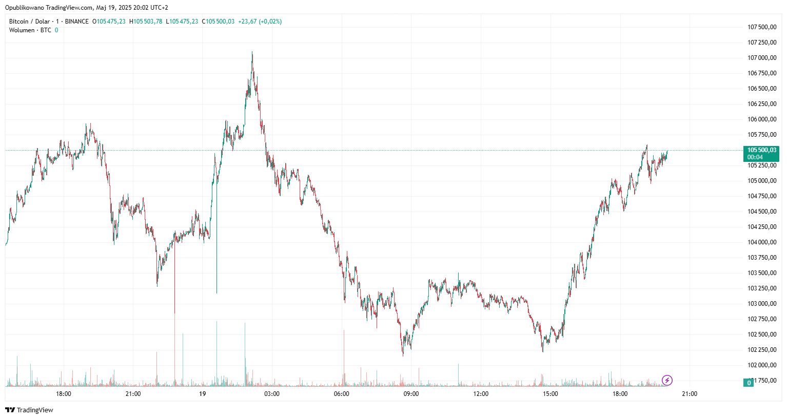 W chwili pisania tego tekstu kurs BTC oscyluje nieco powyżej poziomu 105 500 tys. USD za monetę. Chociaż podczas dzisiejszej sesji handlowej cena tej kryptowaluty spadła w okolice bliskie 102 000 USD, aktualnie obserwujemy na niej odbicie.
