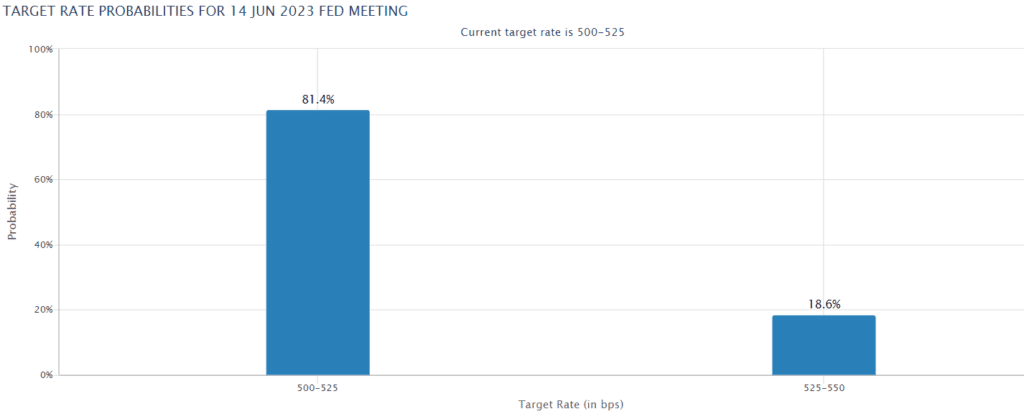 — Breaking Market News (@financialjuice) May 21, 2023Po piątowym przemówieniu Powella widać, iż Fed delikatnie mięknie – pauza jest naprawdę możliwa. Stopy procentowe w USA w tej chwili znajdują się w przedziale 5-5,25%. Są więc najwyższe od 2008 roku! Chociaż inflacja wykazuje pewne oznaki spowolnienia od lata ubiegłego roku, wciąż pozostaje znacznie powyżej celu Fed (2%). Fed stanął w obliczu presji na powstrzymanie się od dalszego zacieśniania (złagodzenie ryzyka recesji). Kashkari z Fed jest otwarty na utrzymanie stóp procentowych na stałym poziomie w czerwcu, informuje WSJ. Jak będzie z pozostałymi członkami Rezerwy Federalnej? W kolejnym tygodniu będziemy świadkami wielu nowych przemówień z ich strony. Wydaje się, ze Rezerwa Federalna naprawdę dostrzega ryzyko zrobienia zbyt wiele na tym etapie cyklu. Potwierdził to też piątkowy Powell.