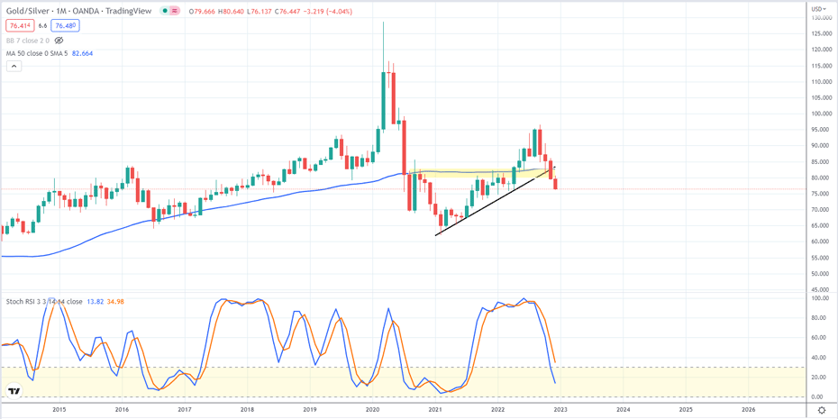 Spojrzenie na poniższy miesięczny wykres wskaźnika złota do srebra pokazuje załamanie od czasu, gdy po raz ostatni pokazaliśmy je w listopadzie, gdy balansowało ono na konfluencji wsparcia, które od tego czasu ustąpiło. jeżeli impet sięga aż do warunków wyprzedania – tak jak powinien, zanim ruch osiągnie dno – wydaje się, iż w tej skali czasowej wskaźnik jeszcze bardziej spadnie.