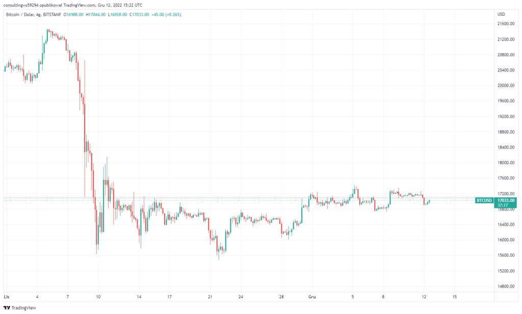 Wykres dobitnie pokazuje, iż Bitcoin chciałby zakończyć spadki i trochę się wybić do góry odrabiając poważne straty. Chciałby ale nie może. Próby wybicia się powyżej 17600 USD kończyły się do tej pory zdecydowaną reakcją sprzedających.