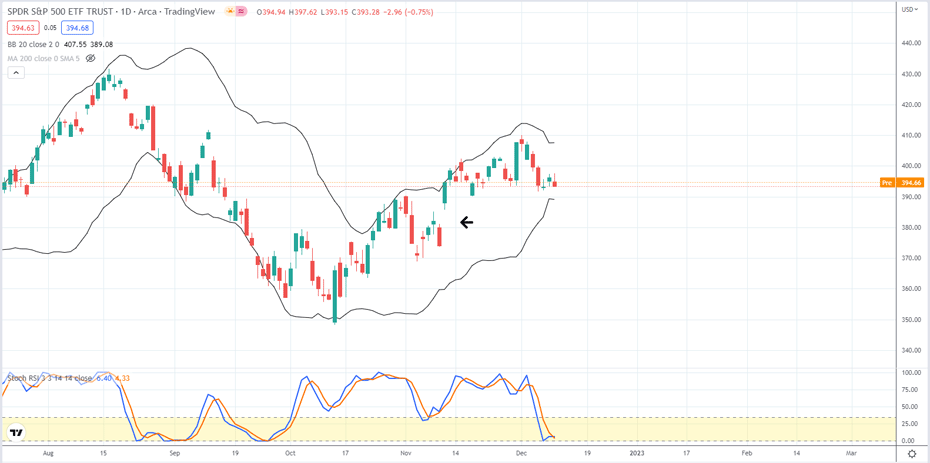 Na wykresie dziennym SPY pokazanym poniżej, momentum jest już w pozycji wyprzedaży, a wstęgi Bollingera zacieśniły się. Chociaż wypełnienie luki spadkowej pozostaje wyraźną możliwością, jest to mniejsze prawdopodobieństwo niż w zeszłym tygodniu.
