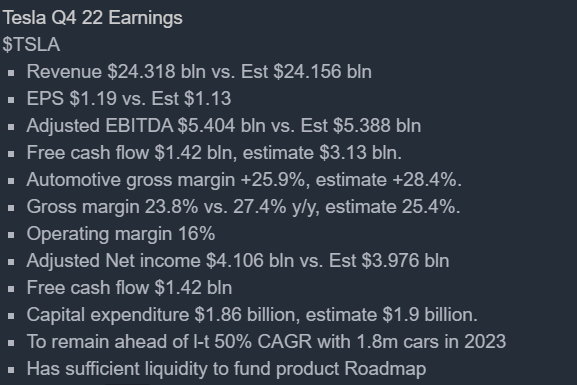 Wyniki Tesli. Źródło: FJPrzychody wyniosły 24,31 mld USD, analitycy spodziewali się 24,15 mld USD. Zysk na akcję 1,19 USD pobił oczekiwane 1,13 USD zysku. Wyraźnie spadły jednak wolne przepływy pieniężne (free cash flow) (1,42 mld USD wobec 3,13 mld USD) oraz marże 25,9% wobec 28,4% oczekiwanych. Spółka szacuje dostawy na 1,8 miliona samochodów w 2023 i przez cały czas celuje w ich 50% wzrost w każdym kolejnym roku. Na dzień 31 grudnia wartość cyfrowych aktywów przechowywanych przez spółkę Elona Muska wyniosła 184 miliony USD.