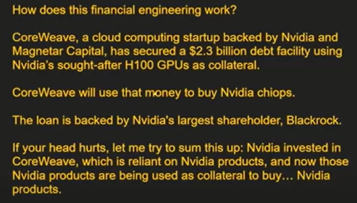 Startup z branży chmury obliczeniowej CoreWeave otrzymał finansowanie 2,3 mld USD, których 'zabezpieczenie’ stanowiły chipy-AI H100 GPU, dostarczane przez Nvidia. Pożyczkę zaaranżował BlackRock, największy udziałowiec Nvidia (ok. 77 mld USD w akcjach) oraz Magnetar Capital. Finalnie dołożyły się do niej inne 'zaprzyjaźnione firmy’ z branży private equity m.in. Blackston, PIMCO, Carlyle, Coatue czy DigitalBridge. Nie byłoby w tym nic dziwnego gdyby nie fakt, że: