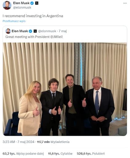 Na przestrzeni ostatniego miesiąca głowa państwa oraz chętnie inwestujący w obiecujące projekty miliarder spotkali się dwukrotnie. Tych kilka publicznych słów Elona Muska oraz wspólne zdjęcie ze spotkania sprawiły, iż nie trzeba było długo czekać na efekty: w ciągu kolejnej doby odnotowano znaczny wzrost argentyńskich memecoinów, takich jak ARG i Argentina od ArgentinaCoin.