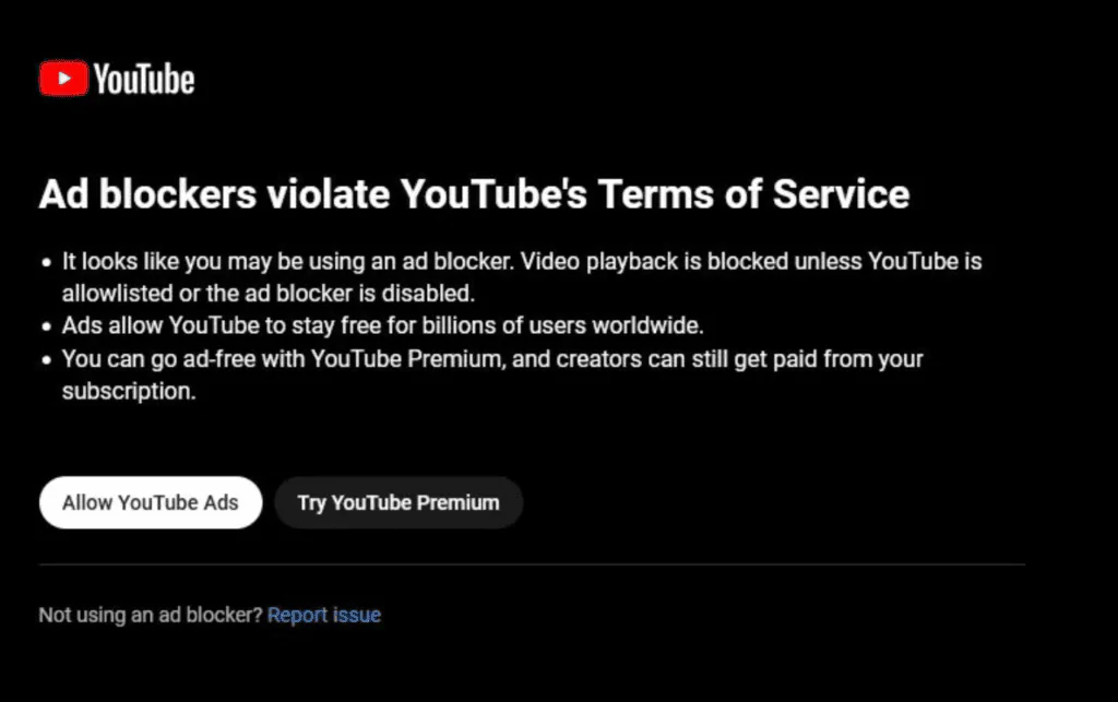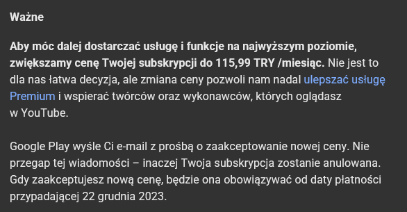 Przykładowy mail jaki otrzymali polskojęzyczni użytkownicy platformy płacący rachunku w obcej walucieNastępnie postanowiono zaatakować zwykłego Kowalskiego korzystającego z systemu typu „AdBlock” stosowanego w popularnych przeglądarkach jak Chrome czy Firefox. YouTube informuje, iż tego typu zabawki „naruszają zasady korzystania z platformy (TOS)” i blokuje odtwarzanie filmów dopóki problematyczne oprogramowanie lub wtyczka nie zostanie wyłączona. Oczywiście, pojawia się też informacja, iż możemy wykupić abonament Premium i cieszyć się portalem bez reklam całkowicie legalnie.
