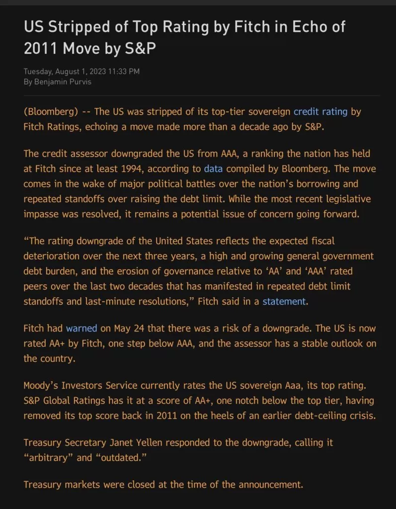 Credit rating agency Fitch has downgraded the US rating from its highest AAA rank to AA+ https://t.co/kTqTlBxjHl