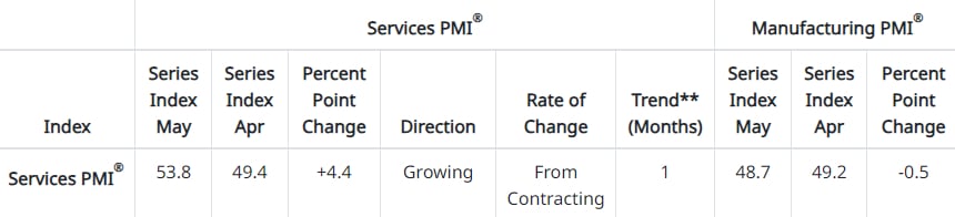 Dane ISM z amerykańskiego sektora usług (za maj). Odczyt główny: 53,8 wobec oczekiwanych 51 i 49,4 w kwietniu