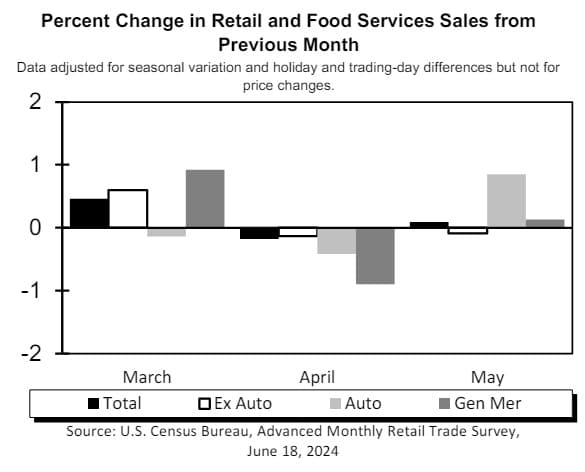 Dzisiejsze dane z gospodarki amerykańskiej były jednymi z najważniejszych w tym tygodniu. Odczyt sprzedaży detalicznej wypadł poniżej prognoz, choć produkcja przemysłowa (za maj) wypadła znacznie lepiej, niż prognozowano. W efekcie reakcja rynku wygląda na dość niepewną. Indeksy z Wall Street początkowo traciły ale powoli wracają do wzrostów, ponieważ silniejszy przemysł zaamortyzował część obaw wokół 'recesyjnych’ sygnałów. Mocniejszy amerykański dolar wyraźnie 'szkodzi’ Bitcoinowi, a jastrzębie komentarze z Fedu (pomimo zwykle słabszych danych z USA) sugerują, iż bank jest zdeterminowany by inflacja sięgnęła 2% celu i nie zaakceptuje 'połowicznego’ zwycięstwa, poddając w wątpliwość wysokość 'neutralnej stopy procentowej’.