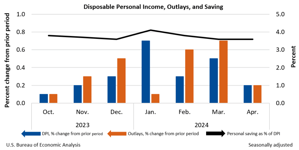 Jak czytamy na stronie głównej US Bureau of Economic Analysis: „Dochód osobisty Amerukanów wzrósł w kwietniu o 65,3 miliarda dolarów (0,3 procent w ujęciu miesięcznym). Rozporządzalny dochód osobisty (DPI) pomniejszony o bieżące podatki osobiste – wzrósł o 40,2 mld USD (0,2%). Wydatki osobiste tj. suma osobistych wydatków konsumpcyjnych (PCE), odsetek i bieżących płatności transferowych – wzrosły o 42,8 mld USD (0,2%). Wydatki konsumpcyjne wzrosły o 39,1 mld USD (0,2%). Oszczędności osobiste wyniosły 744,5 mld USD. Stopa oszczędności osobistych – oszczędności osobiste jako procent rozporządzalnego dochodu osobistego – wyniosła w kwietniu 3,6%.”